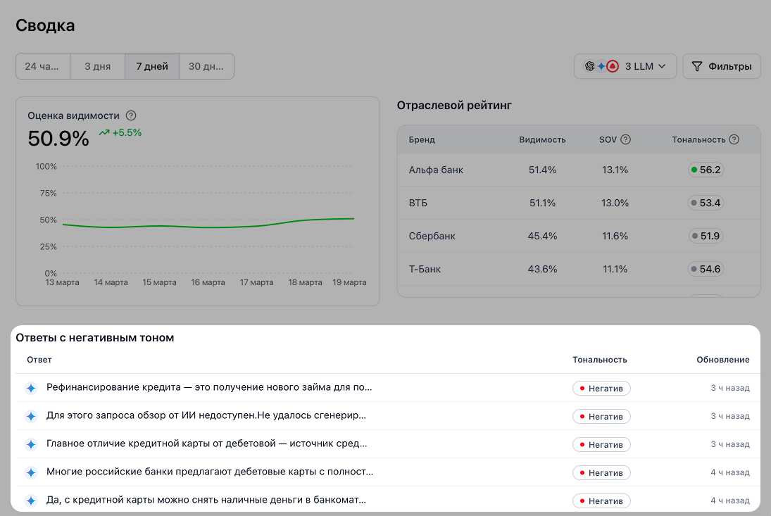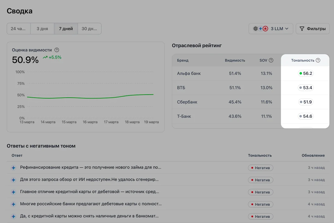 Тональность показывает, в каком контексте ИИ говорит о бренде: негативно, нейтрально или позитивно.