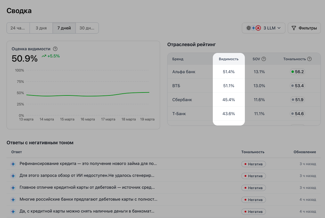 Видимость = Ответы с упоминанием бренда / Все протестированные ответы × 100%Что влияет на метрику